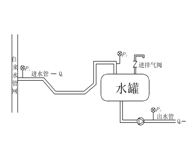 進水管從水罐上部注水入罐。罐頂裝有一個注排氣閥,它具有在滿水時關閉,在罐內(nèi)產(chǎn)生負壓或水位下降時打開閥門補入大氣的作用,所以也被稱為“真空消除器”“真空補償器”等。該類裝置有浮子、浮球等機械式、有靠電接點真空表或水罐水位接點控制電磁閥啟閉的電動式等方式各異,名稱標新的很多品類。在水罐注滿水時此閥閉緊,此時水罐為承壓的密閉容器,可視為管路上增加了一個有突然放大和突然縮小局部阻力損失的異徑管。罐底連接至水泵進水口,并建立了水泵出水口的靜水頭。